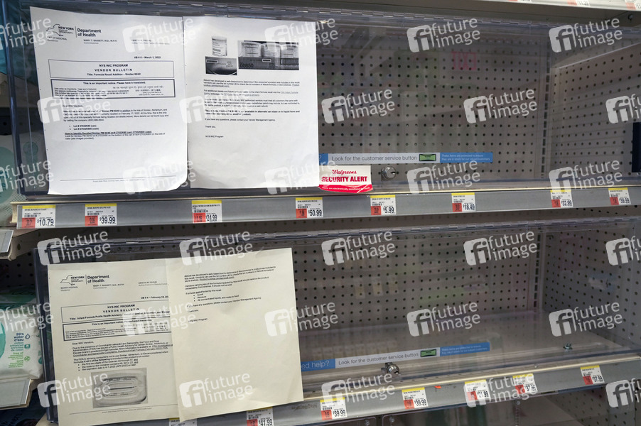 Fast leere Regale in der Babynahrungsabteilung eines Lebensmittelgeschäfts, Der Bürgermeister von New York City erklärt den Ausnahmezustand angesichts des landesweiten Mangels an Babynahrung, Dadurch wird die Befugnis gegeben , Preistreiberei für Babynahrung nach den New Yorker Regeln zu verhindern. Der landesweite Mangel an Säuglingsnahrung ist aufgrund eines freiwilligen Rückrufs bestimmter Pulvernahrungen durch Abbott Nutrition, nach Beschwerden, dass vier Babys, die Produkte aus der Pflanze konsumierten, an einer bakteriellen Infektion erkrankten, eskaliert. Zwei der Baby starben. New York, 22.05.2022