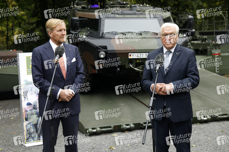 König Willem-Alexander der Niederlande und Frank-Walter Steinmeier beim Treffen mit Soldatinnen und Soldaten anlässlich von 30 Jahre Deutsch-Niederländisches Corps auf dem Gelände des Corps. Münster, 25.09.2025