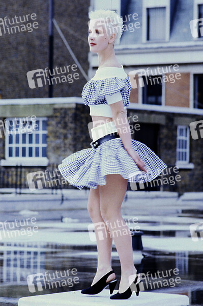 Paula Yates bei einer Modepräsentation auf einem Dach. London, 15.09.1987