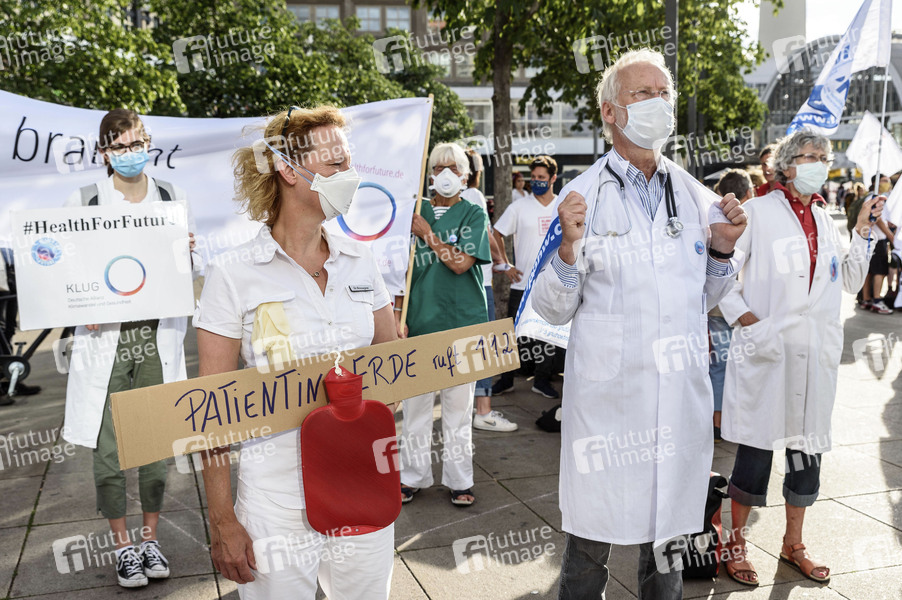 Berlin4Future - Ärzte von Health for Future bei der Kundgebung für mehr Klimaschutz am Berliner Alexanderplatz. Die Bewegung Berin4Future sieht sich als Pendant der Bewegung Fridays For Future für Erwachsene und Berufstätige. Auch sie fordern die Einhaltung des Pariser Klimaschutzabkommens und den Kohleausstieg. Berlin, 03.08.2020