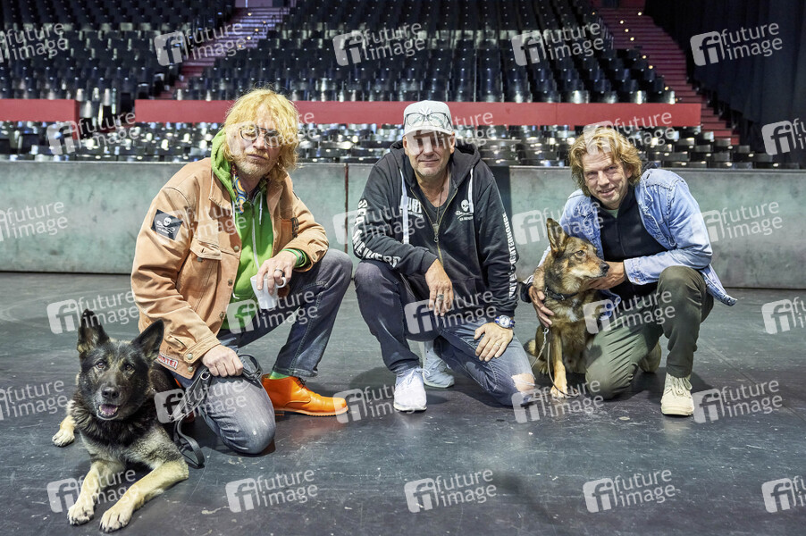 Christof Stein-Schneider, Kai Wingenfelder und Rainer Schumann von Fury in the Slaughterhouse mit Corona-Spürhunden bei der Prästentation der Konzertreihe 'Back to Culture' in Verbindung mit einer Teststudie mit Corona-Spürhunden in der Swiss Life Hall. Hannover, 19.09.2021