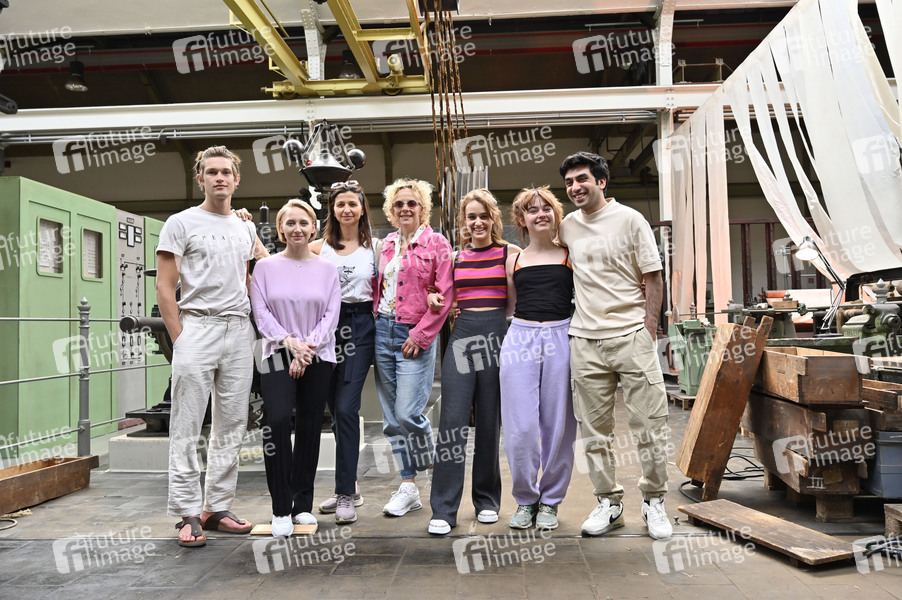 Damian Hardung, Anna Maria Mühe, Mira Thiel, Katja Riemann, Rocio Luz, Ella Lee und Omid Memar beim Fototermin am Set der 2. Staffel der ARD TV-Serie 'Unsere wunderbaren Jahre' im Monforts Quartier. Mönchengladbach, 14.06.2022