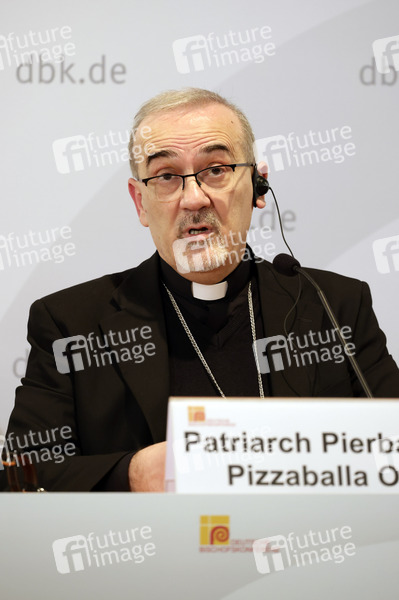 Prominenz, Pressekonferenz, PK, Versammlung, Treffen, Deutsche Bischofskonferenz, DBK, Zusammenschluss der römisch-katholischen Bischöfe aller Diözesen in Deutschland, Katholische Kirche, Glaube, Religion, Kleriker, Theologe, Kardinal, OFM, Lateinischer Patriarch von Jerusalem, Italienischer Erzbischof