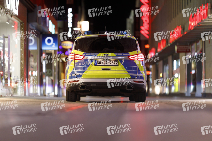 In Köln gelten seit dem 17.04.2021 um 0 Uhr Ausgangsbeschränkungen. Das Verlassen der Wohnung ist dann in der Zeit von 21 Uhr bis 5 Uhr fast ausnahmslos verboten. Die Beschränkungen beschloss der Krisenstab der Stadt Köln am Freitag. Ordnungsamt und Polizei kontrollieren die nächtlichen Straßen wie die Einkaufsstraße Hohe Straße im Bild. (Themenbild, Symbolbild) Köln, 17.04.2021