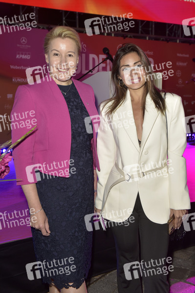 Franziska Giffey mit Gast beim VBKI-Sommerfest 2025 am Gasometer Schöneberg auf dem EUREF-Campus. Berlin, 12.09.2025
