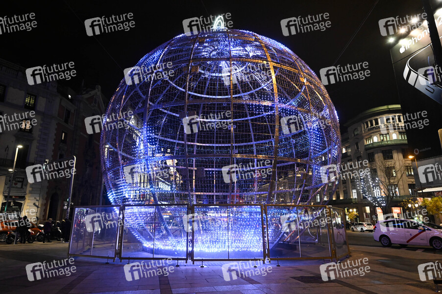 Weihnachtskugel Installation auf der Calle de Alcala - Einschalten der traditionellen Weihnachtsbeleuchtung im Stadtzentrum. Madrid 26.11.2020