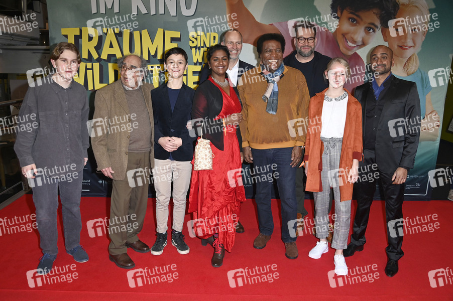 Noah Lakmes, Irshad Panjatan, Emil Mascheck, Sushila Sara Mai, Clemens Schaeffer, Roberto Blanco, Lars Montag, Annlis Krischke und Murali Perumal bei der Premiere des Kinofilms 'Träume sind wie wilde Tiger' im CinemaxX Halle. Halle (Saale), 02.02.2022