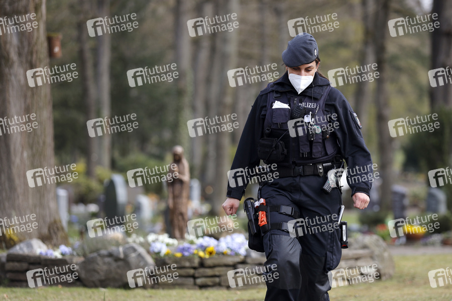 Die Stadt Leverkusen befürchtete eine größere Menschenansammlung bei der Beerdigung eines hochrangigen Clan-Mitglieds einer Großfamilie und damit Verstöße gegen die Corona-Schutzverordnung. Polizisten begehen das Gelände des Friedhof Reuschenberg vor der Beerdigung. Leverkusen, 09.04.2021