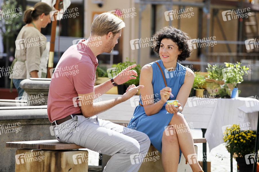 Bernd-Christian Althoff und Liza Tzschirner am Set des ARD-Fernsehfilms 'Der Ranger - Paradies Heimat' auf dem Marktplatz. Stadt Wehlen, 14.08.2019