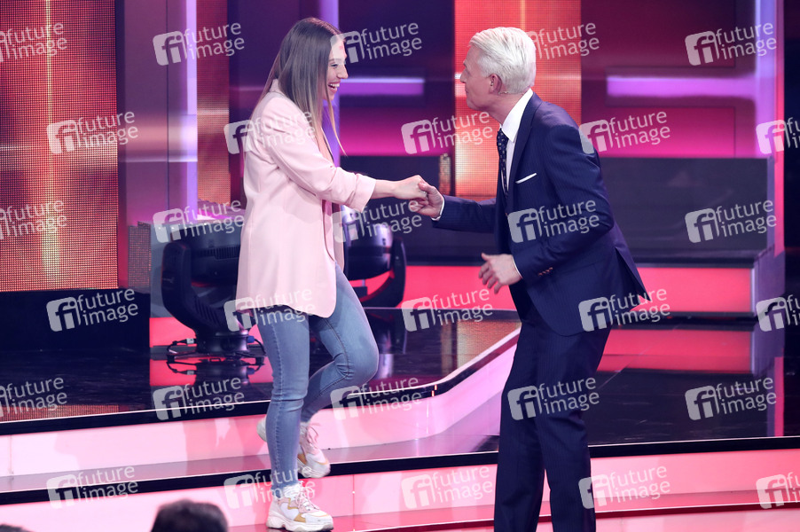 Bianca Claßen mit Guido Cantz bei der Aufzeichnung der ARD-Unterhaltungsshow 'Verstehen Sie Spass?' in den Bavaria Studios. Geiselgasteig bei München, 03.04.2019