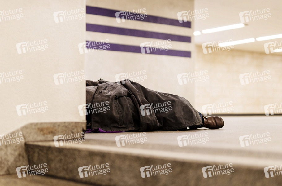 Ein Obdachloser schläft improvisiert einer Decke in einer U-Bahn-Haltestelle. Köln, 04.12.2019