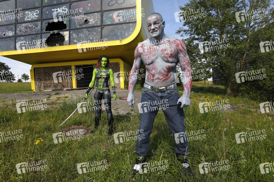 GEEK ART - Bodypainting meets SciFi, Fantasy and more: 'Guardians of the Galaxy' Photoshooting mit Janina Stein als Gamora und Fred Krull als Drax auf dem Expo Gelände. Laatzen, 25.06.2019 - Ein Projekt des Fotografen Tschiponnique Skupin und des Bodypainters und Transformakers Enrico Lein