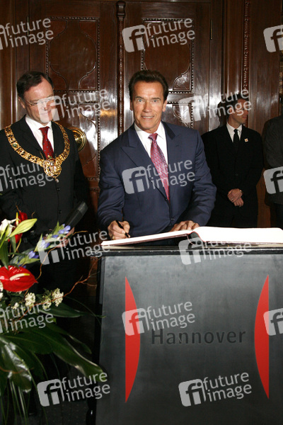 Hannovers Bürgermeister Weil empfängt den kalifornischen Gouverneur Schwarzenegger im Neuen Rathaus zum Eintrag ins Goldene Buch