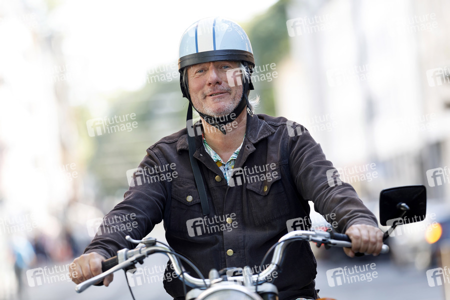 Jürgen Becker in einem Motorrad mit Beiwagen beim Fotocall zum WDR-Film 'Besuch aus dem Westen - Jürgen Becker unterwegs im Osten Deutschlands' im Mauritiussteinweg. Köln, 22.08.2019
