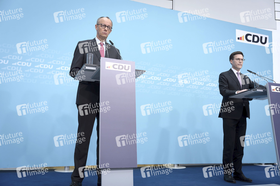 Friedrich Merz und Manuel Hagel bei der Pressekonferenz zu den Ergebnissen der Gremiensitzungen der CDU im Konrad-Adenauer-Haus. Berlin, 09.03.2026