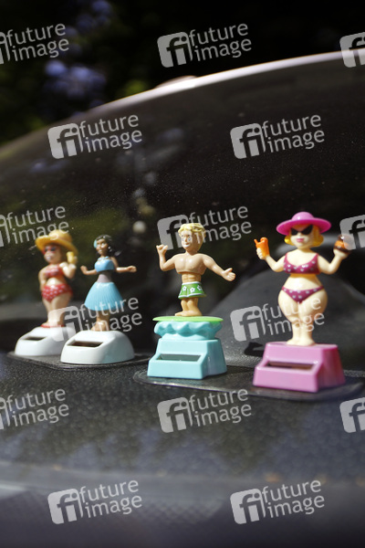 Auf dem Armaturenbrett eines in der Sonne geparkten Autos stehen bei sommerlichen Temperaturen mehrere leicht bekleidete Wackelfiguren. (Themenbild, Symbolbild) Köln, 19.06.2021