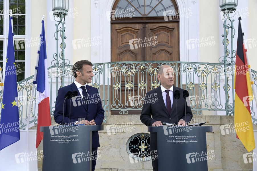 Emmanuel Macron und Olaf Scholz beim Treffen des Deutsch-Französischen Ministerrats im Gästehaus der Bundesregierung Schloss Meseberg. Meseberg, 28.05.2024