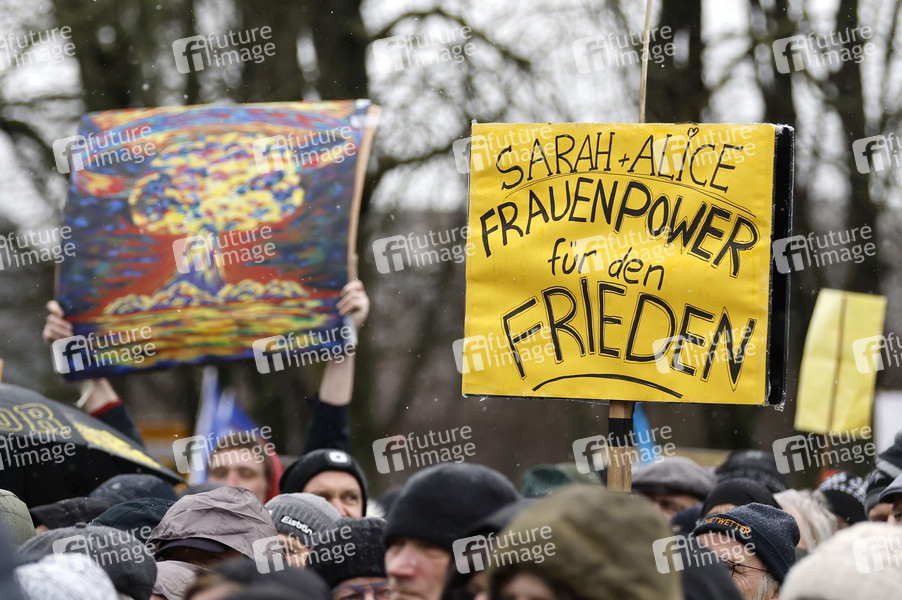Umstrittene Friedensdemo und Kundgebung für Verhandlungen mit Russland statt Waffenlieferungen für die Ukraine am Brandenburger Tor. Dazu aufgerufen haben die Linken-Politikerin Sahra Wagenknecht und die Frauenrechtlerin Alice Schwarzer. Berlin, 25.02.2023