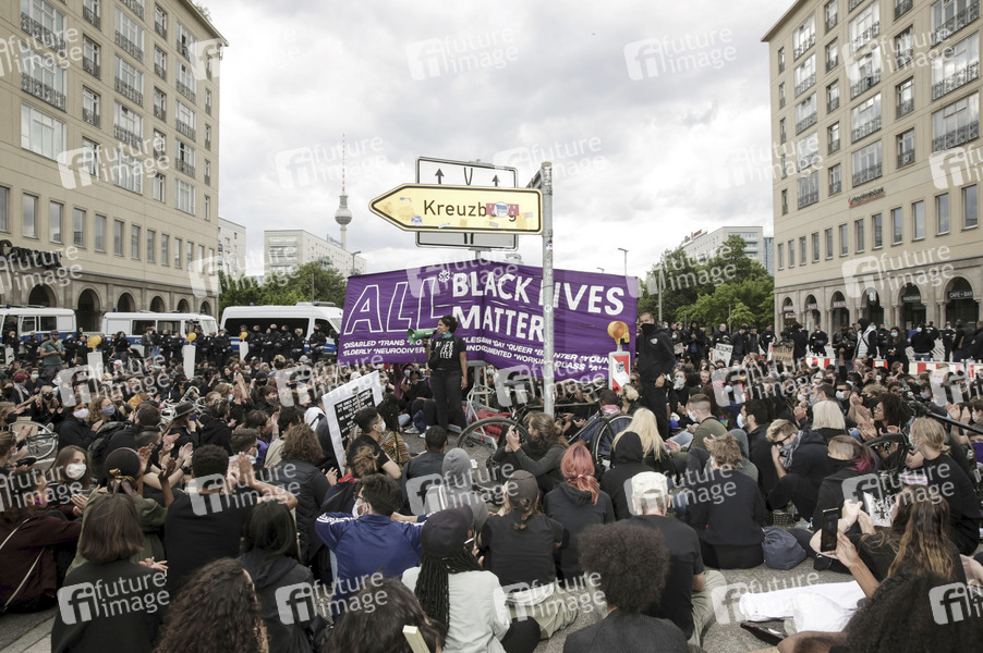 Ein Teil der Demonstranten der 'Silent Demo' am Alexanderplatz zog weiter zum Strausberger Platz und veranstaltete eine Sitzblockade. Berlin, 06.06.2020