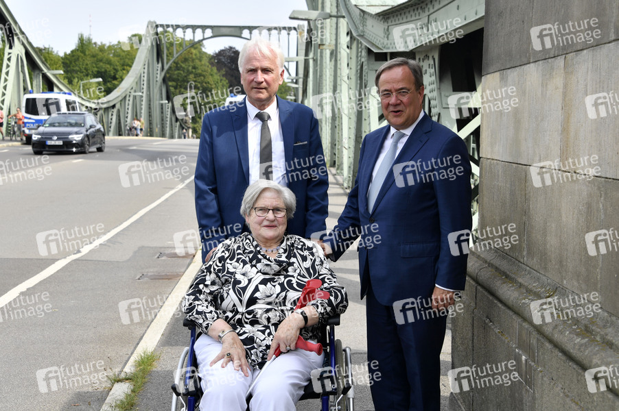 Dieter Dombrowski, Maria von Pawelsz-Wolf und Armin Laschet bei einer Gedenkveranstaltung zum 60. Jahrestag des Baus der Berliner Mauer an der Glienicker Brücke. Potsdam, 13.08.2021