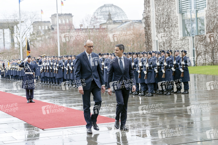 Friedrich Merz und Rob Jetten beim Empfang des Ministerpräsidenten der Niederlande mit militärischen Ehren zu einem gemeinsamen Gespräch mit anschließendem Pressestatement im Bundeskanzleramt. Berlin, 16.03.2026