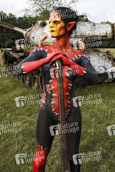 Bodypainting, Body-Painting, nackt, Körperkunst, Körperfarben, Farbe, Bemalung, Kunst, Malerei, draußen, Science Fiction, Sci-Fi, SciFi, Fantastic, Dystopie, Endzeit, Panzer, Krieg, Höllenwesen, Teufel, Dark Fantasy, Kriegerin, Dämon, M47 Patton Kampfpanzer, body painting, nude, body art, colors, outdoors, dystopia, tank, war, hell being, warrior, demon