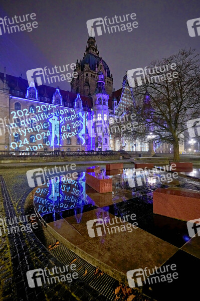 Das Rathaus wird anlässlich Handball-Turniers illuminiert. Am 14., 16. und 17. März kämpfen die Männer-Nationalmannschaften Deutschlands, Österreichs, Kroatiens und Algeriens in einem Turnier in der ZAG Arena um die Qualifikation für die Olympischen Spiele in Paris. Um dieses Ereignis auch in der City sichtbar zu machen, wird das Neue Rathaus am Trammplatz an drei Abenden mit wechselnden und teils bewegten Handball-Motiven illuminiert. Es handelt sich um eine gemeinsame Aktion der Landeshauptstadt Hannover und der Hannover Tourismus GmbH. Hannover, 13.03.2024