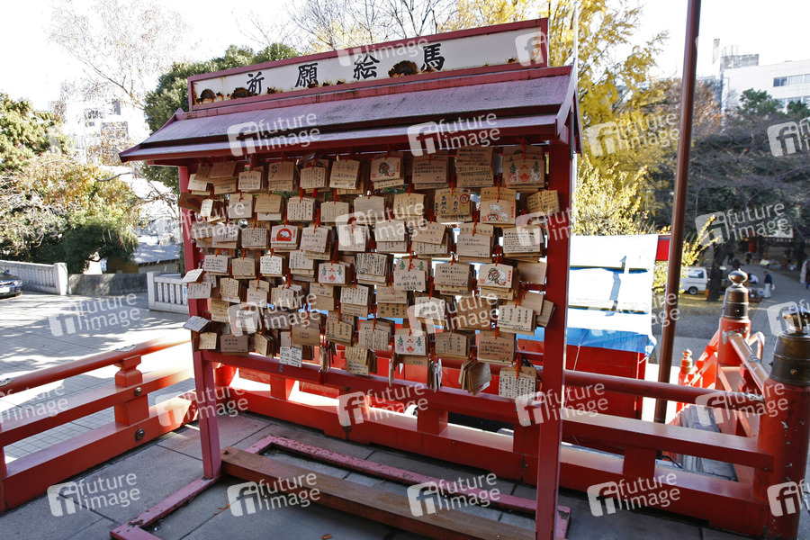 Shinto Schrein, einseitig bemalte Holztäfelchen auf denen Bitten an die Gottheiten geschrieben werden, japanische Schriftzeichen