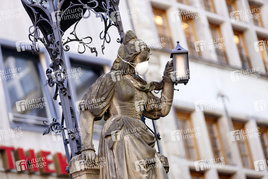 Die Schneidersfrau auf dem Heinzelmännchenbrunnen in der Kölner Altstadt hat eine Atemschutzmaske um. Köln, 18.03.2020