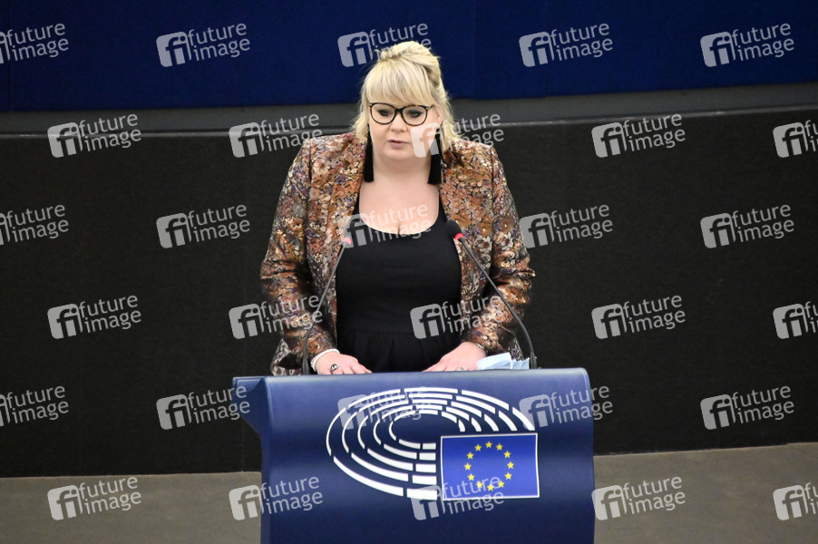 Aurélia Beigneux, Tiertransporte, Plenartagung, Plenardebatte, Plenarsitzung, Debatte, Rede, Außenpolitik, Strasbourg, Europaparlament, EU-Parlament, EP, Parlament der Europäischen Union, Parlamentum Europaeum, MdEP, Mitglied des Europäischen Parlaments, Politikerin, Frankreich, Rassemblement National, RN, Fraktion Identität und Demokratie, ID