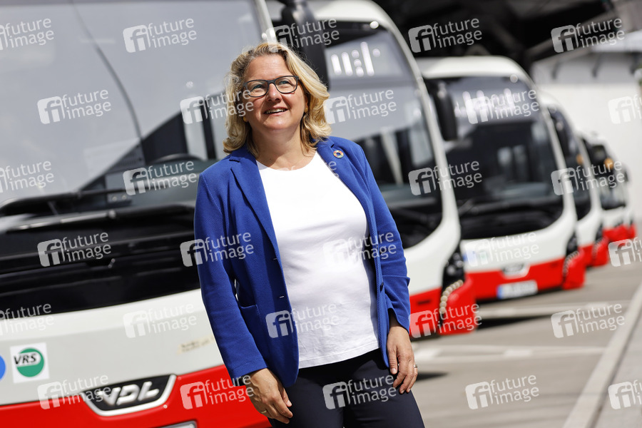 Svenja Schulze beim Besuch von Umweltministerin Svenja Schulze und NRW-Verkehrsminister Hendrik Wüst bei der KVB Köln mit symbolischer Inbetriebnahme der neuen Ladeinfrastruktur für Elektro-Busse. Köln, 29.06.2021