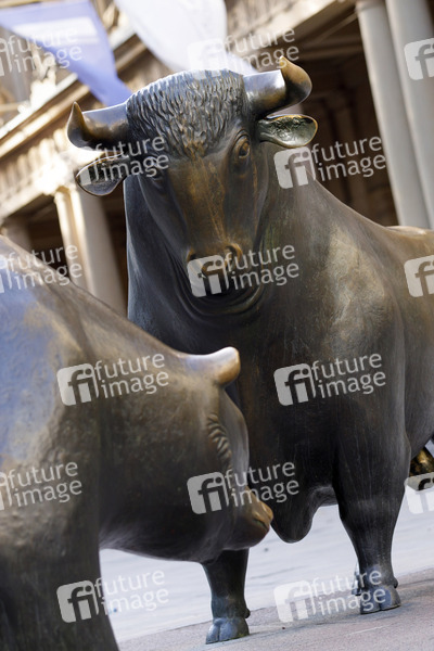 Bulle und Bär vor der Frankfurter Wertpapierbörse, wo es am Montag zu einem extremen Kurssturz kam. Bullenmarkt oder Hausse steht an der Börse für anhaltend steigende Kurse und Bärenmarkt oder Baisse für anhaltend sinkende Kurse. Frankfurt, 09.03.2020