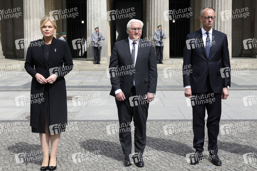 Julia Klöckner, Frank-Walter Steinmeier und Friedrich Merz bei der Kranzniederlegung mit den Repräsentantinnen und Repräsentanten der Verfassungsorgane des Bundes zum 80. Jahrestag des Endes des Zweiten Weltkrieges in Europa in der Neuen Wache. Berlin, 08.05.2025