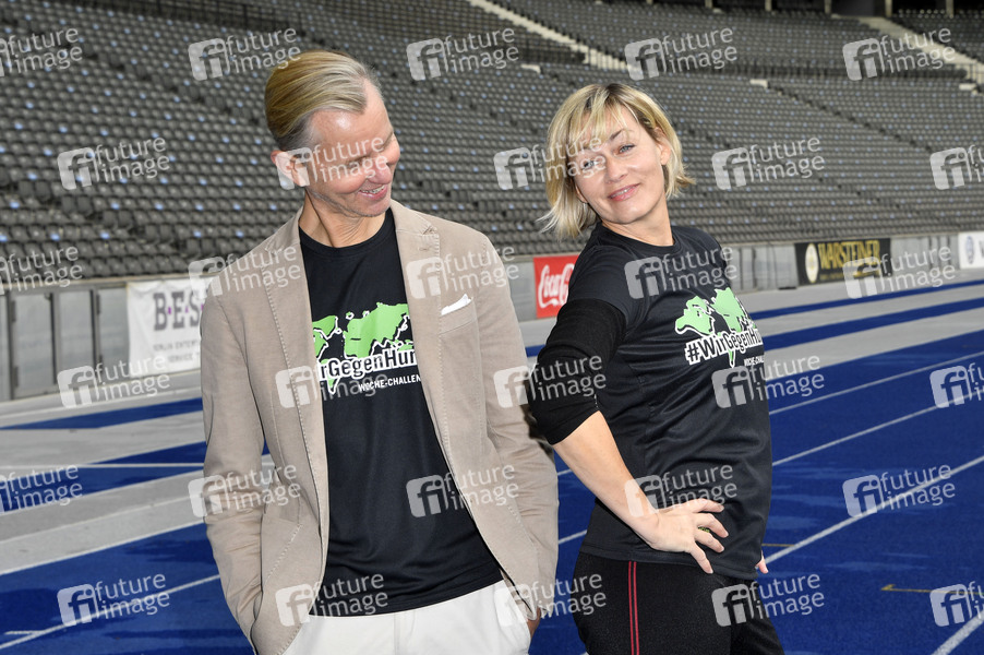 Max Raabe und Gesine Cukrowski beim Fototermin zur sportichen '#WocheChallenge' im Olympiastation Berlin. Unter dem Motto 'Wir können was bewegen!' ruft die Welthungerhilfe zu dieser Challenge auf und bittet um Spenden für eine Welt ohne Hunger. Berlin, 09.10.2020
