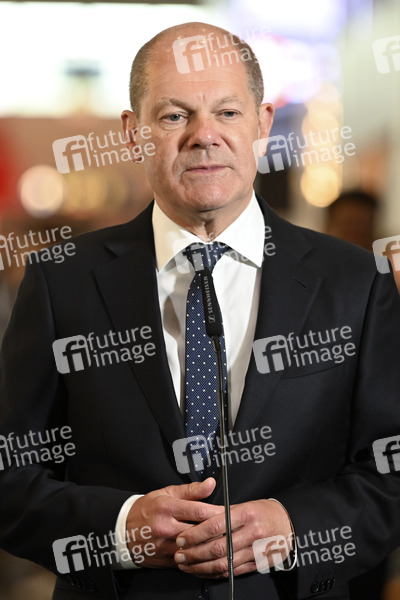 Olaf Scholz beim Pressestatement nach dem Eröffnungsrundgang auf der Hannover Messe 2022 auf dem Messegelände. Hannover, 30.05.2022
