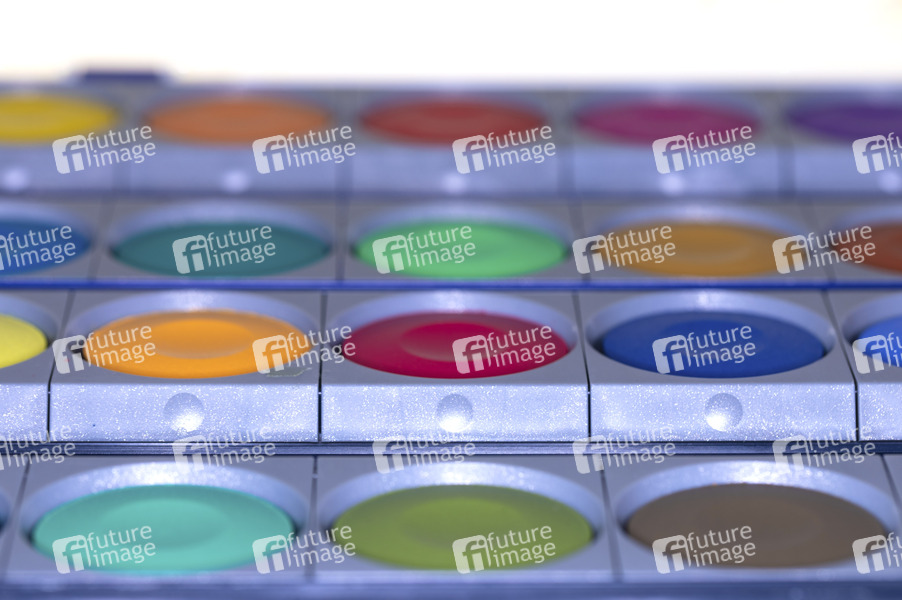 Wasserfarben in eineim Tuschkasten - Malen trainiert die kognitiven Fähigkeiten eines Kindes, was sich wiederum positiv auf die Intelligenz auswirkt. Malen fördert sowohl die Grob- als insbesondere auch die Feinmotorik. (Symbolfoto, Themenfoto)