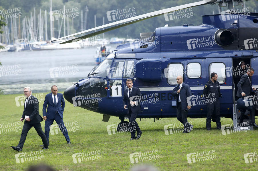 Emmanuel Macron beim Empfang des französischen Staatspräsidenten zu einem gemeinsamen Gespräch mit dem Bundeskanzler in der Borsig-Villa am Tegeler See. Berlin, 23.07.2025