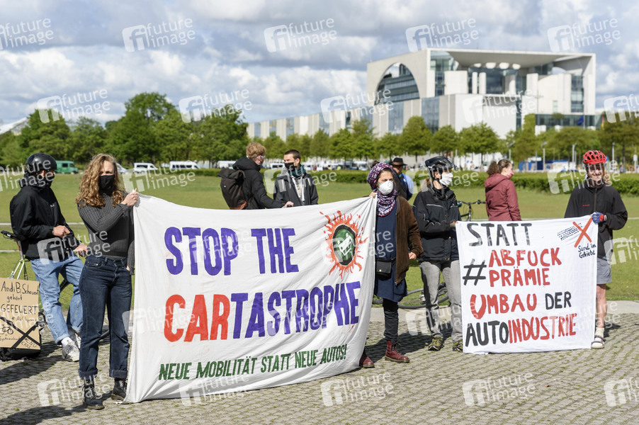 Mit vier Kundgebungen zwischen Kanzleramt und Bundestag protestieren Aktivisten von Campact, Fridays for Future, Ende Gelände, die Interventionistische Linke, Naturfreunde und die Umweltschutzorganisation Greenpeace vor dem Autogipfel im Berliner Kanzleramt gegen eine von den Autokonzernen geforderte Autoprämie. Diese neue Abwrackprämie soll im Rahmen einer Telefonkonferenz zwischen Bundeskanzlerin Merkel mit Vertretern der Automobilindustrie beschlossen werden. Berlin, 05.05.2020