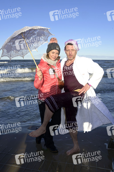 Jessica Ginkel und Hendrik Duryn beim Baltic Lights 2023 Charity-Hunderennen zu Gunsten der Welthungerhilfe zwischen der Seebrücke Ahlbeck und der Seebrücke Heringsdorf. Heringsdorf, 04.03.2023