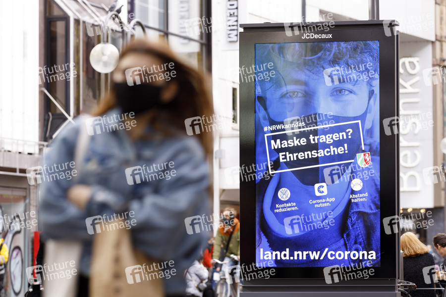 Köln ist weiter Corona-Risikogebiet: Inzidenzwert stieg am Dienstag auf 181,9. Die meisten Veranstaltungen bleiben weiterhin verboten. Geschäfte, Spiel- und Bolzplätze, Schwimmbäder und Fitnessstudios haben aber noch geöffnet. Im Bild eine Kampagne des Landes NRW, die Passanten in der Schildergasse auf die dort geltende Maskenpflicht in Fußgängerzonen und die Corona-App hinweist. (Themenbild, Symbolbild) Köln, 26.10.2020