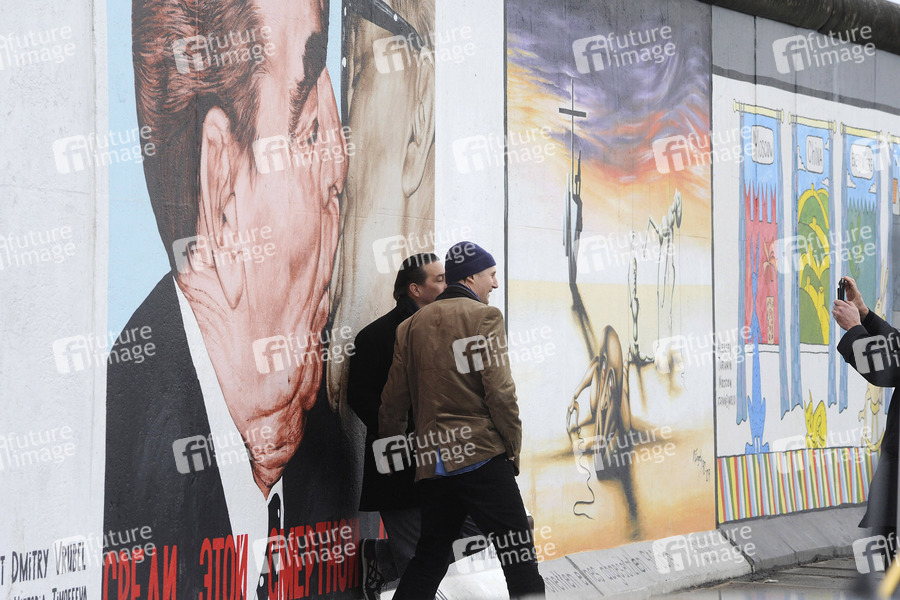 Liam Neeson besucht die Berliner Mauer an der East Side Gallery während einer Drehpause zu seinem Thriller 'Unknown Identity'