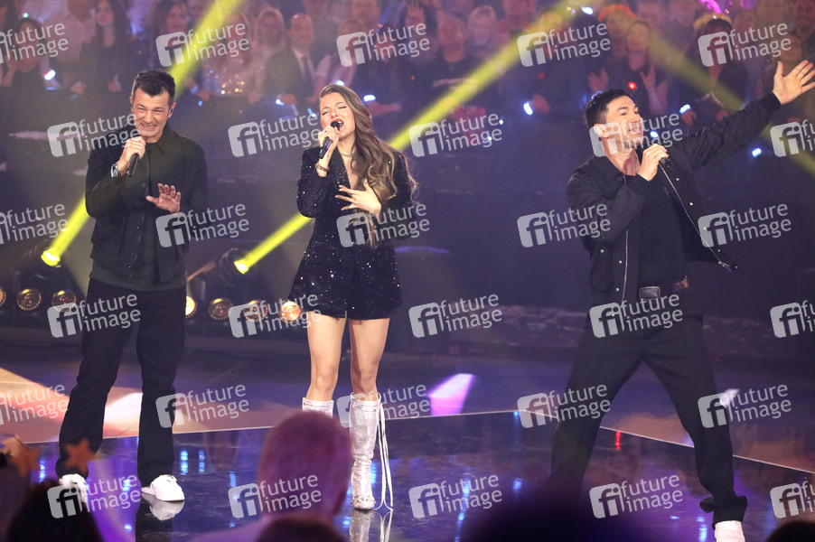 Achim Petry, Joelina Drews und Lucas Cordalis in der TV-Show 'Silvester-Schlagerbooom 2026 live - Die Wunderlichtershow!' im BMW Park. München, 31.12.2025