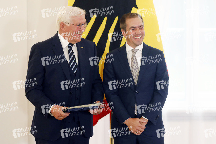 Frank-Walter Steinmeier und Philipp Lahm bei der Verleihung des Verdienstkreuzes am Bande der Bundesrepublik Deutschland an Philipp Lahm im Schloss Bellevue. Berlin, 01.10.2025