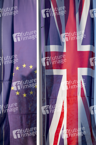 Flaggen Europa und Vereinigtes Königreich am Europa Park. Rust, 20.02.2020
