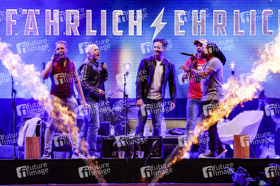 Oliver Pocher, Dittmar Bachmann, Alexander Klaws, Matze Kop und Mola Adebisi mit dem Programm 'Gefährlich ehrlich' live bei der Autokultur-Konzert-Reihe auf dem Schützenplatz. Hannover, 12.07.2020