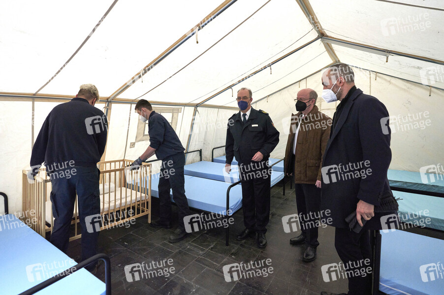 Dieter Rohrberg (Leiter der Feuerwehr Hannover), Volker Kluwe (Polizeipräsident der Polizeidirektion Hannover), Belit Onay (Oberbürgermeister der Landeshauptstadt Hannover) und Mitglieder der Feuerwehr Hannover - Zeltdörfer-Unterkünfte für ukrainische Kriegsflüchtlinge in der Halle 27 auf dem Messegelände, inklusive Wasch- und Duschmöglichkeiten, errichtet von der Feuerwehr Hannover. Die spätere Versorgung erfolgt durch das DRK. Hannover, 06.03.2022