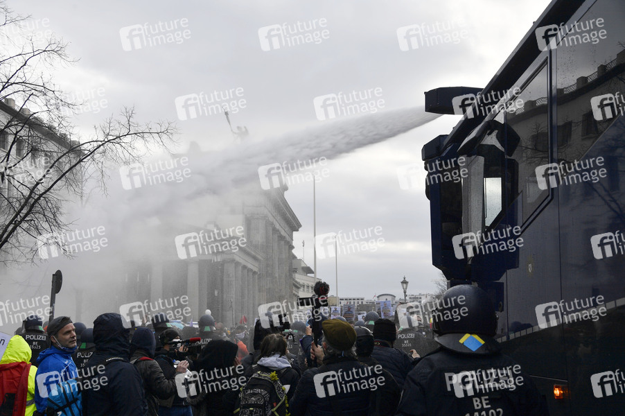 Tausende Demonstranten protestieren am Brandenburger Tor und im Regierungsviertel gegen die Corona-Politik der Regierung. Wegen der massenhaften Verstöße gegen die Hygieneauflagen hat die Polizei die Proteste unter Einsatz von Wasserwerfern beendet. Berlin, 18.11.2020
