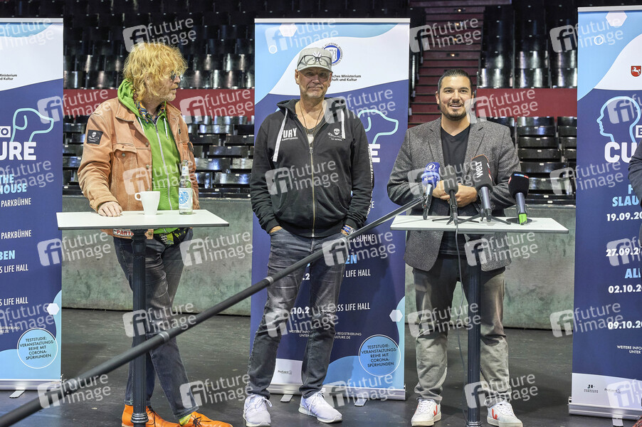 Christof Stein-Schneider und Kai Wingenfelder (Fury in Slaughterhouse) und Nico Röger (Geschäftsführer Hannover Concerts) bei der Prästentation der Konzertreihe 'Back to Culture' in Verbindung mit einer Teststudie mit Corona-Spürhunden in der Swiss Life Hall. Hannover, 19.09.2021