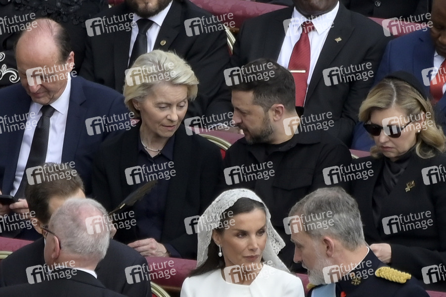 Ursula von der Leyen, Wolodymyr Selenskyj, Olena Selenska, Königin Letizia von Spanien und König Felipe VI. von Spanien bei der Amtseinführung von Papst Leo XIV. auf dem Petersplatz. Vatikanstadt, 18.05.2025