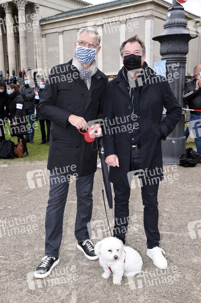 Patrick Lindner mit Ehemann Peter Schäfer und Hund Obelix bei der Kundgebung 'Aufstehen für Kultur' auf dem Königsplatz. München, 24.10.2020
